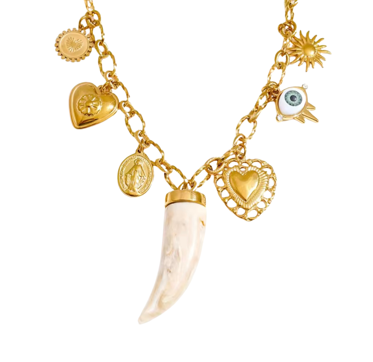 Este hermoso collar de acero inoxidable es el complemento perfecto para cualquier atuendo. Sus dijes llamativos agregan un toque de elegancia y estilo a tu look. Además, el material de acero inoxidable asegura durabilidad y resistencia. Un accesorio versátil y moderno para cualquiera que busque un toque de distinción.