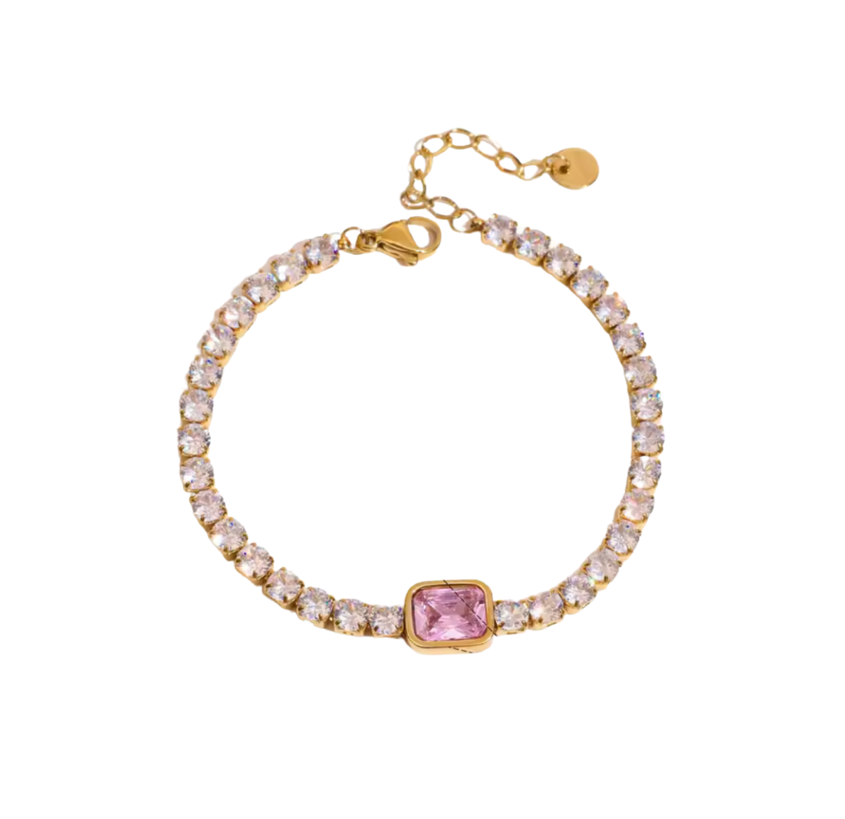 "La pulsera Karina pink está hecha de acero inoxidable resistente al agua, lo que la hace ideal para el uso diario. Además, es redimensionable, lo que significa que se ajustará perfectamente a tu muñeca. Con esta pulsera, podrás lucir un look elegante y a la vez resistente."